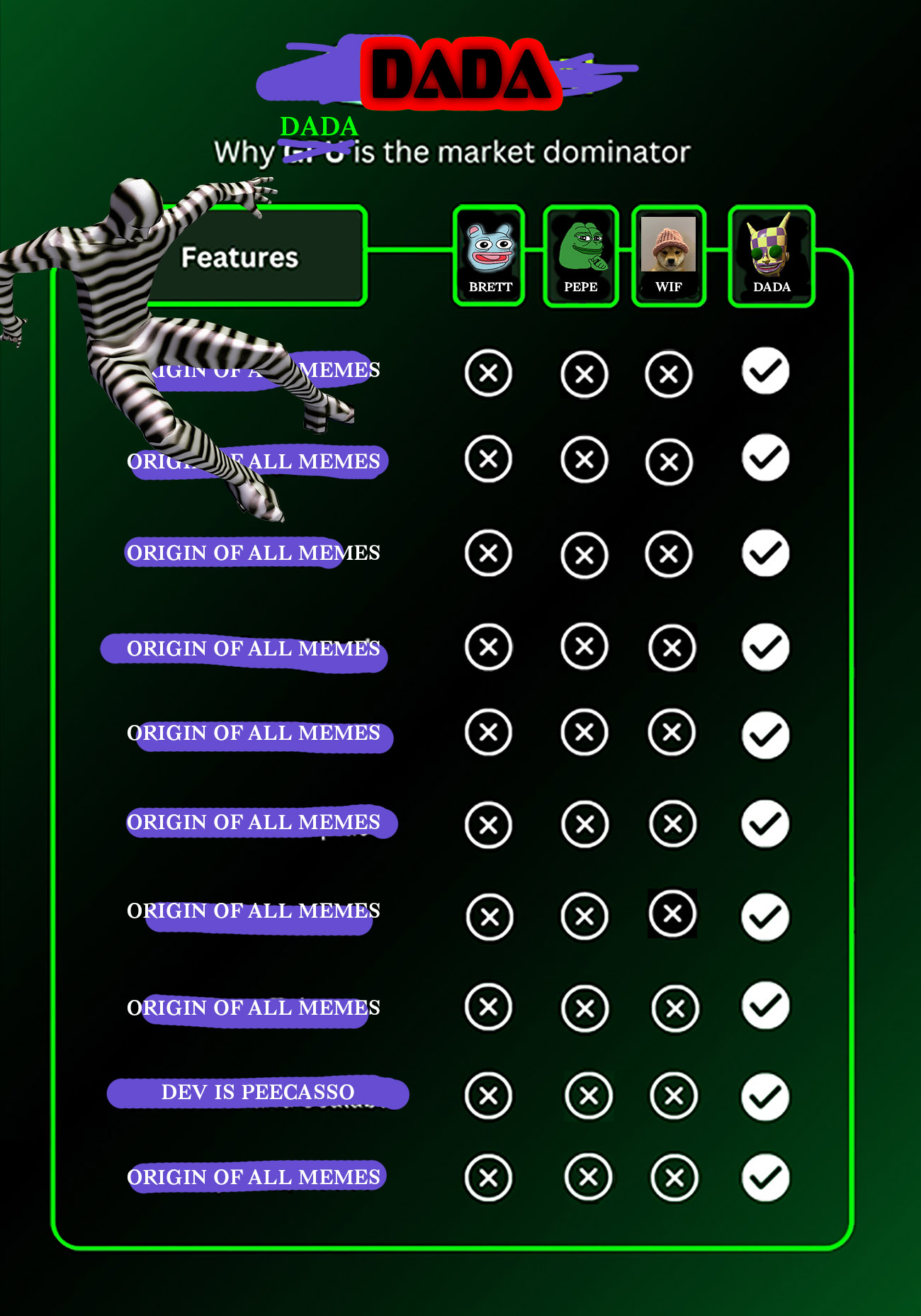 $DADA is a crypto memecoin born from the concept of Dadaism and its use of absurdity, often cited as the conceptual origin of the meme itself. Like the original 20th-century art movement, $DADA challenges and critiques reality through irrationality. Rather than depicting the absurdity of contemporary capitalism, $DADA actively produced and enacted it in real time, exposing a financial logic driven by hope, and collective hallucination.