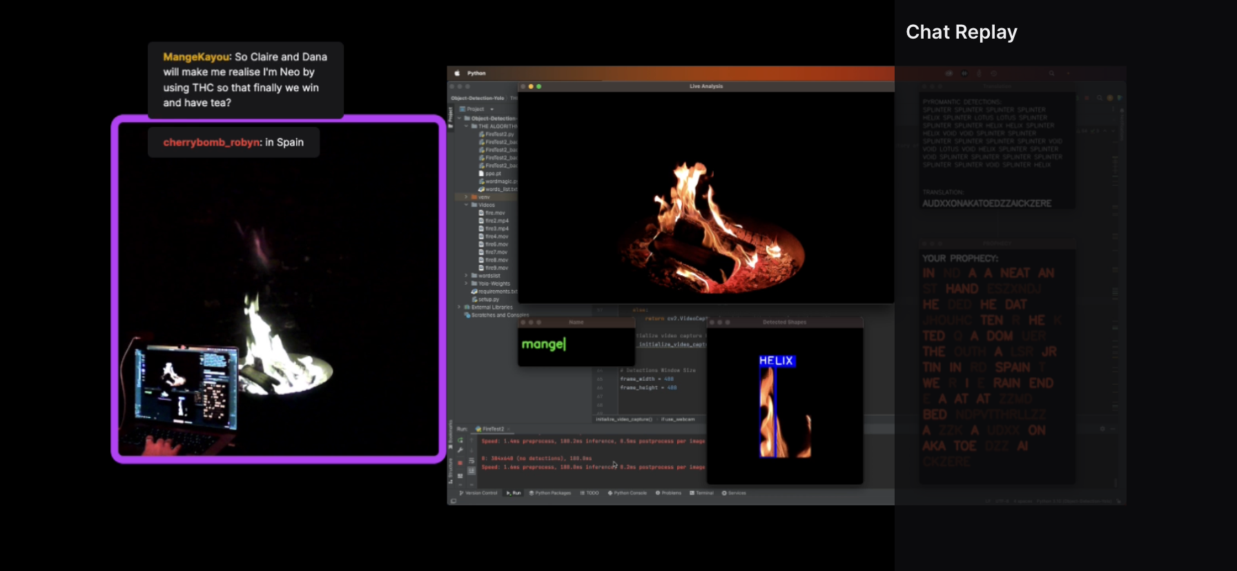 "Inspired by Pyromancy, the alleged art of deciphering the future through the observation of fire and its phenomena, I created this self-operating object detection AI. It possesses the capability to perform an automated pyromantic ritual and present a prophecy to the viewer," says the artist.
